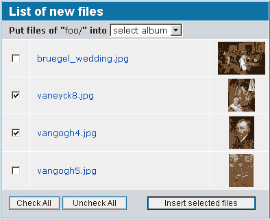 - markera de filer du vill ladda upp (genom att bocka för dem). Nya filer är automatiskt förbockade, de som redan finns i din databas är inte förbockade. Markera sedan det album dit du vill lägga dina filer. Klicka på "Lägg till markerade filer" för att starta uppladdningsprocessen.