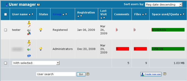 In this documentation, the term "user" is used for visitors of your gallery who have registered an account and have logged in. The term "visitor" is used for all who access your gallery, both registered users as well as unregistered guests. Registration features (if visitors are allowed to register in the first place and how registration will work) can be configured in the corresponding section of the config panel. Coppermine comes with a user management of it's own that allows you to control what group your users are in (group membership controls permissions) unless you disable the built-in user management in favor of bridging Coppermine with another app. If you enable bridging, the bridging application will take over and control your users instead of Coppermine.