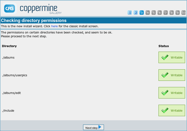 Coppermine needs write permissions in some sub-folders as suggested in Setting permissions. The installer can't set those permissions for you, so you need to set them in advance. If you have done so successfully, all folders that the install wizard checks in this stage should be marked as "OK". If this is not the case for you (i.e. if the install wizard complains about missing permissions in one or more folders), just leave the browser window as it is and set permissions properly. After having done so, return to the install screen that you have left open in your browser and refresh the page (by using the corresponding refresh button in your browser) to see if the permission issue has been solved.You can only click the next button if the needed permissions are set.